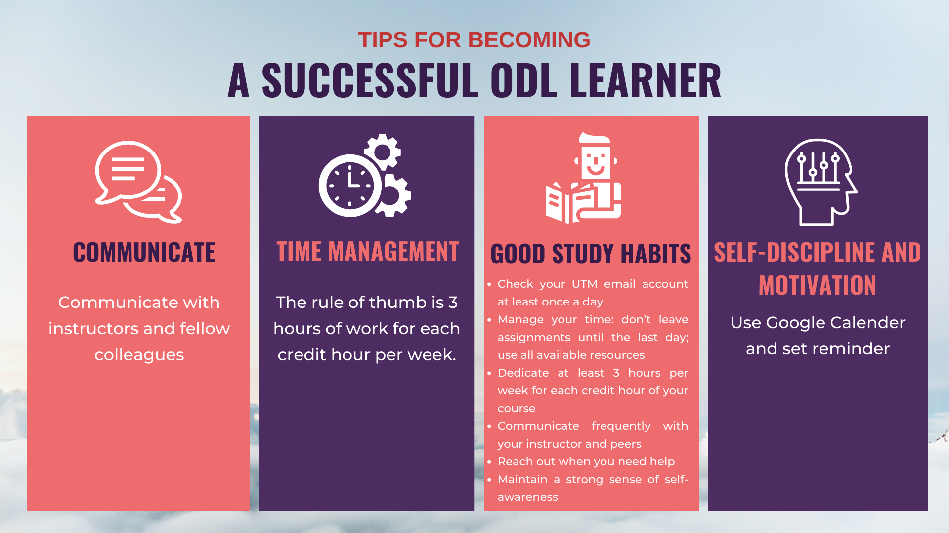 As a UTM ODL student, you are required to comply with the rules and regulations. Students must register for the courses at the beginning of the semester, pay the tuition fees, and practice academic integrity during their studies.